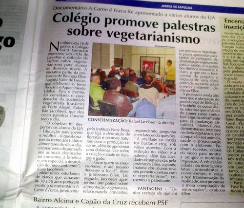 A palestra teve a melhor repercussão possível. Os alunos adoraram o ótimo jeito de palestrar do Rafael, fizeram muitas perguntas, elogiaram muito a palestra e o filme. A palestra até saiu no Jornal Vale do Sinos, onde deixei bem claro: é obrigação do profissional de Biologia informar que o consumo de carne contribui para o aquecimento global.
