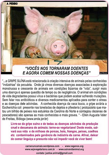 E sobre a curiosa imagem de um livro de Jerry Rubin, que traz entre outras fotos a de uma mulher nua carregando uma cabeça de porco numa baixela: “vou me dando conta de como é impressionante o estágio de indiferença em que nos encontramos. Como é possível viver no meio de uma chacina e de um genocídio animal desses sem desesperar-se? Frangos, porcos, vacas, peixes, patos, rãs, camarões, coelhos, faisões, ovelhas, nenhuma espécie escapa à fome sanguinária dos homens, desses barrigudos inúteis que saem dos restaurantes de Montmartre palitando os dentes e arrotando”.