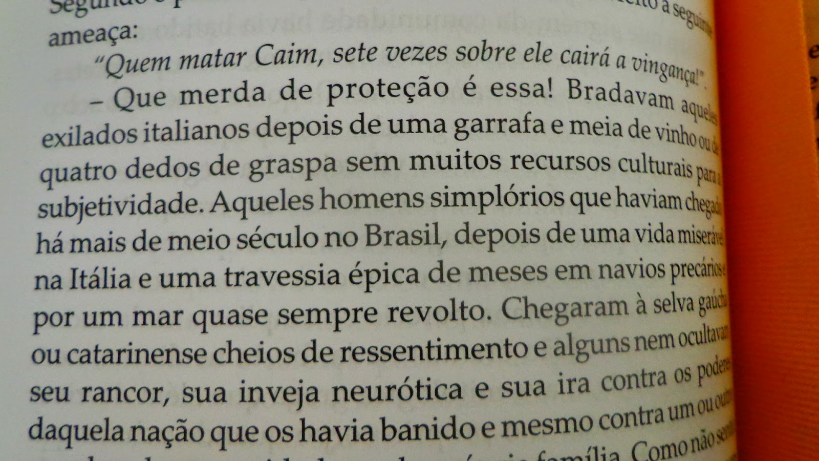 O livro foi especial para mim, pois sou de origem italiana, meus nonos vem do mesmo lugar de onde fala este autor. E também quase tudo no livro evocava parte de minhas memórias, lá da minha família. Caim e abel, essa historieta banal e simplória, é um arquétipo do odioso relacionamento familiar, onde os irmãos são colocados uns contra os outros, sempre por culpa dos pais. E uma prova de que deus não está nem aí, uma indicação da insanidade maternal e da ausência paterna, outras patologias e do instinto sanguinário de deus e das religiões, que sacrificam animais e pessoas, amam sangue a todo custo, etc, etc.