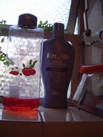 Este quase no fim é o melhor que conheço e possui selo vegano! É o xampu da Surya de morango com menta. Ele é super natural, perfumado e dura muito. É o meu preferido por ser totalmente vegano. Outras marcas podem não testar em animais, mas seus ingredientes nem sempre são veganos... muita atenção nessa hora... O xampu ao lado é da minha amiga Gabbi Bronzati, que deixou ali para quando vem me visitar. (Isso é uma honra para mim, ter os amigos por perto e suas coisas.) Ele também não é testado e é um xampu específico para quem tem cabelos coloridos.